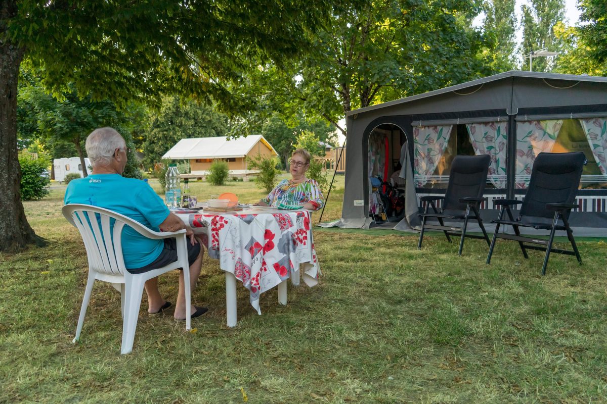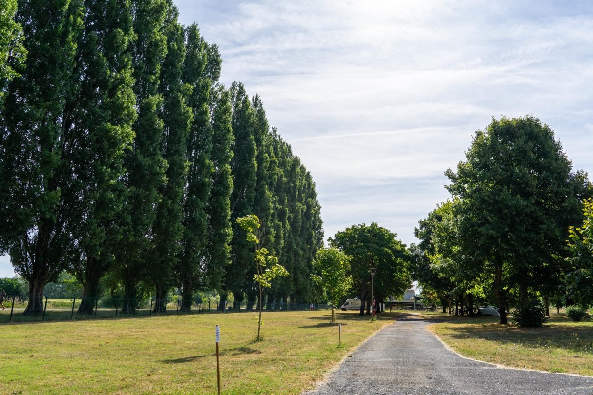 Schaduwrijk terrein naast sportief complex (zeilen, zwembad, tennis, waterskiën, vissen), aan oever van de Cher.